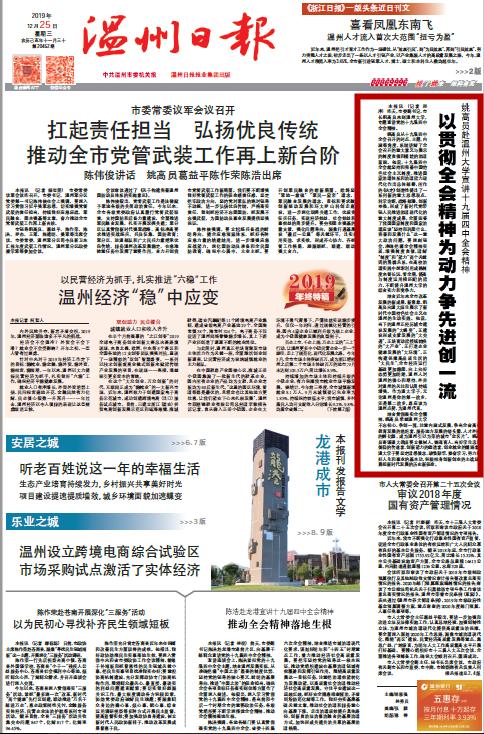 结合贯彻落实全会精神,姚高员希望LY体育·(国际)官方网站不忘初心、争创一流,注重内涵式发展,争当全省高等教育发展的追赶者、服务地方发展的桥头堡、人才外溢的孵化器,成为温州引以为荣的城市“金名片”。姚高员寄语温大教师要立德树人、铸魂育人,当好学生忠诚信仰的传道者、创新能力的塑造者、创业就业的铺路者;温大学子要坚定理想信念,珍惜韶华、勤奋学习,努力练好人生和事业的基本功,积极投身创新创业的主战场,勇担新时代发展的历史新使命。