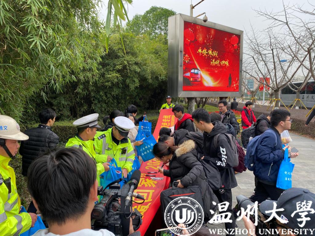 春运首日,随着各大高校陆续开始放寒假,大学生返程迎来高峰。我校专门安排28辆/次大巴,免费送九百多名师生到温州各大车站,温州市公安局交通管理局的交警还专程上门服务,为送站专车提供安全监测,确保师生平安回家。