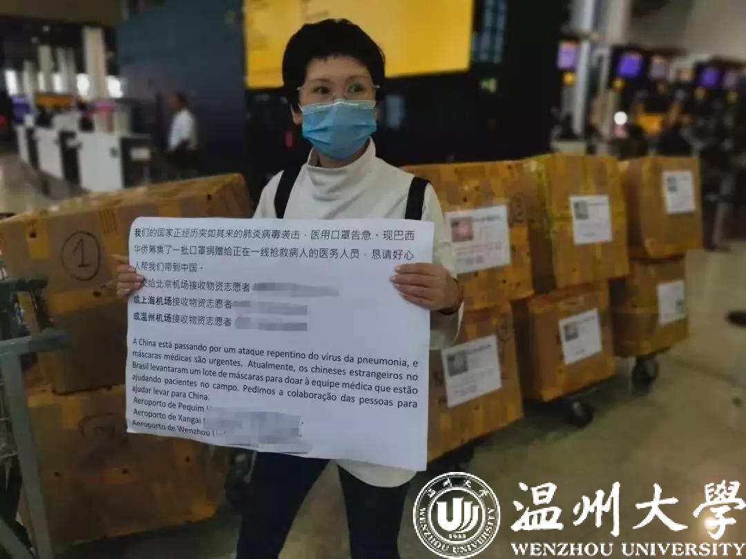 L校友夫妇在巴西经商,当他们听说国内急需大量口罩,便马上采购了两批N95口罩并于1月27日到位。为了快速运抵温州一线医生手里,采取了2万只口罩“人肉”带回,另一批走菜鸟货运。由于货运等渠道报关手续繁琐、耗时长,巴西圣保罗回国的航班又少,一直无法及时运回国内,L校友夫妇心急如焚。正好30日有航班至国内,L校友一家便将该批口罩运至圣保罗机场,在机场守候了4个多小时,请求搭乘航班的乘客“人肉””带回。