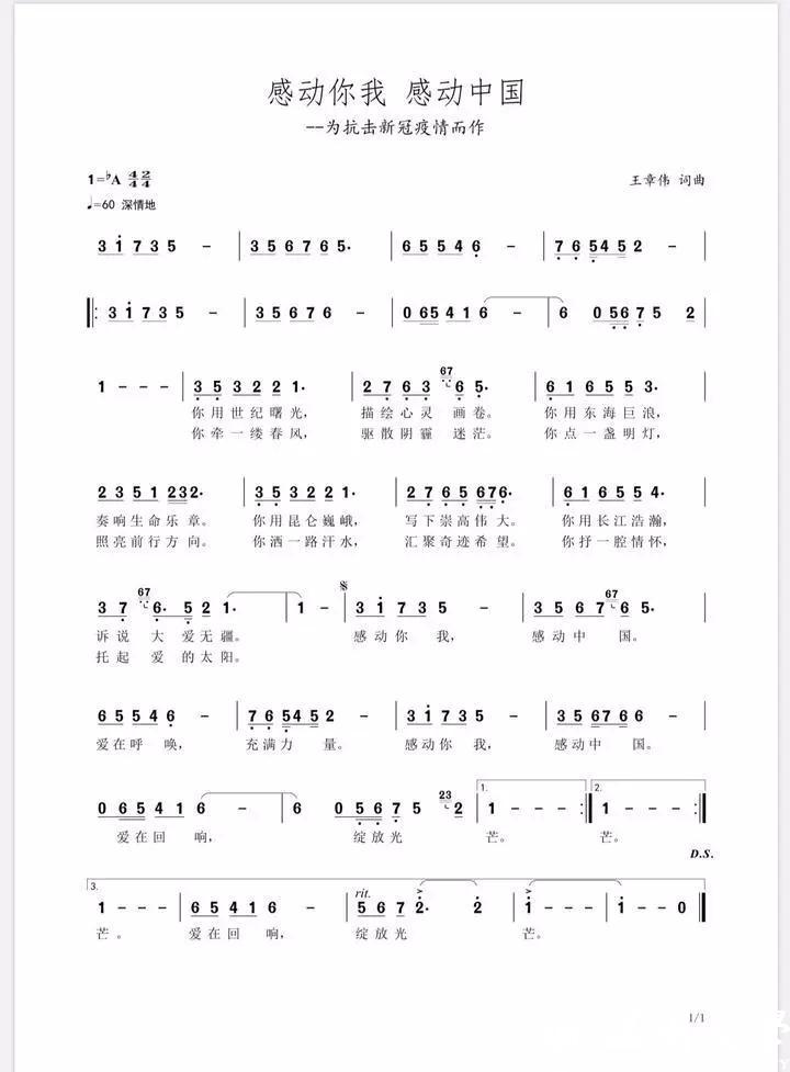 王章伟是浙江工业职业技术学院体艺部的一名音乐教师。新冠肺炎疫情发生后,他第一时间向武汉疫区汇出了1500元的爱心捐款,且与爱人一起向所在社区的党组织报到,成为一名光荣的防疫志愿者。在志愿服务的20多个日日夜夜里,他送别了自己的表妹与侄女奔赴防疫一线,看到一批又一批的医护工作者不畏生死奋战在抗疫一线,看到由社会各界爱心汇聚的物资一批又一批的驰援疫区,看到一批又一批坚守在基层抗疫一线的干部群众用自身铸就的“防疫长城”。他深受感动,谱写了歌曲《感动你我,感动中国》。