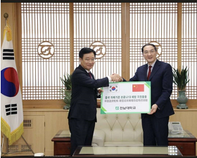 韩国全南大学校长丁炳硕教授日前向中国驻光州总领馆孙显宇总领事赠送医用口罩供我校疫情防控使用。