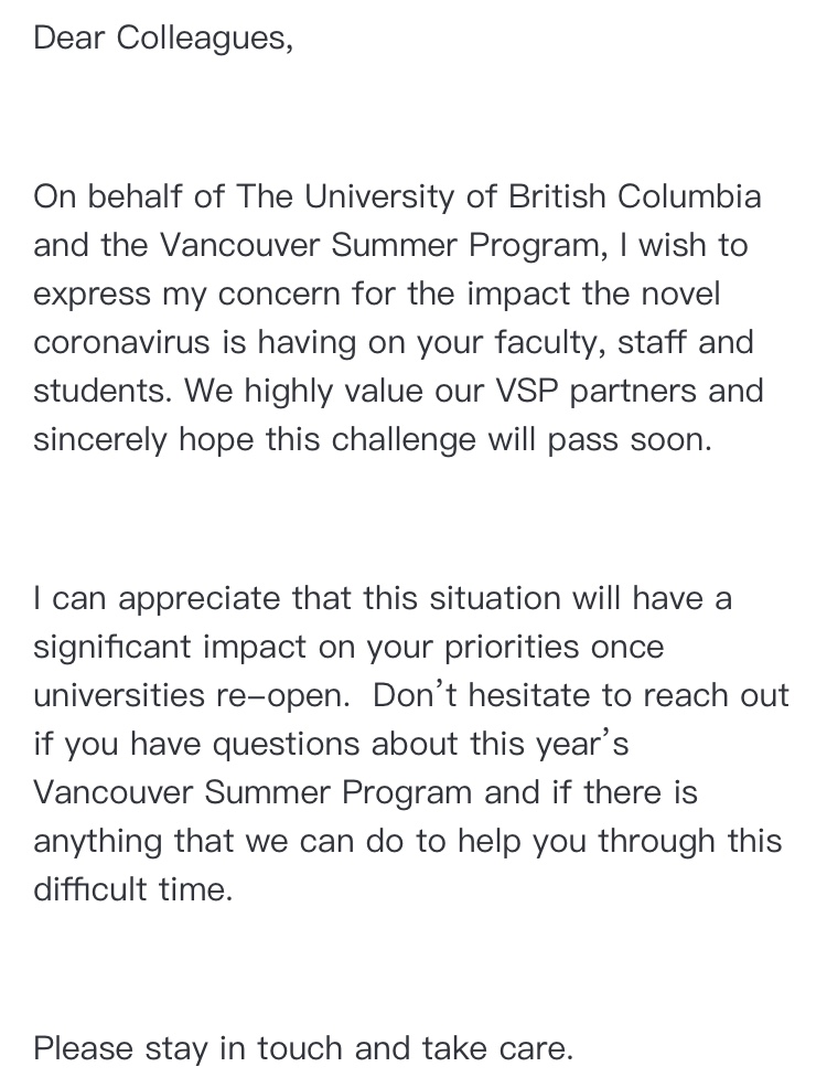 加拿大英属哥伦比亚大学向我校发来慰问信,并真诚的祝愿我们能尽快渡过难关。