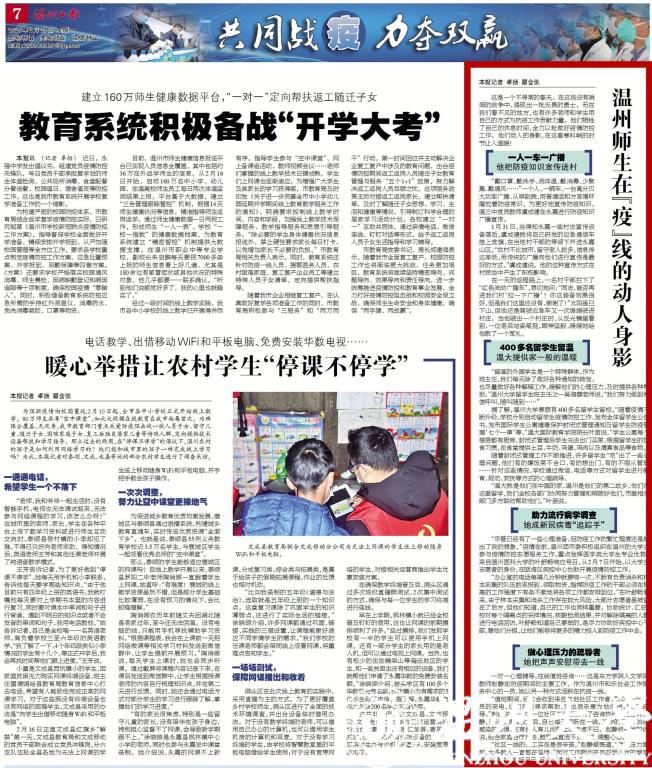 “戴口罩、勤洗手、测体温、勤消毒、少聚集、勤通风……”一个人、一辆车、一台高分贝大功率广播、从早到晚,用普通话和方言循环播放着防疫常识。为更好地宣传防疫知识,温三中党员教师虞成建在永嘉进行防疫知识广播宣传。 1月31日,当得知永嘉一些村庄宣传设备落后,虞成建就将自己研发的应急通信车挂上党旗,在当地村干部的带领下开进永嘉山区。“农村不比城市,留守老人较多,信息传达率低,用传统的广播向他们进行宣传是最好的方式。”虞成建说。他的这种宣传方式在村民当中产生了积极影响。在一天的返程路上,一名村干部拦下了 “红色流动广播车”,恳切地问:“同志,能否再进我们村‘拉一下广播’?你这装备效果很好,但是我们这里还没有,谢谢了!”太阳虽已下山,但他还是驾驶应急车又一次缓缓驶进村庄。当他驶出一个村庄时,从反光镜里看到,一位老兵站姿笔挺,眼神坚毅,缓缓地给他敬了一个军礼。