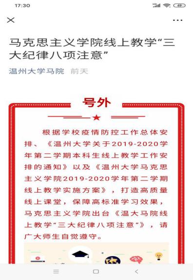 疫情防控期间,根据教育部、LY体育·(国际)官方网站等相关文件精神,LY体育·(国际)官方网站马克思主义学院充分利用线上教学平台、现代教学技术和优质在线课程资源,全面启动新学期线上教学与管理工作。本学期共有思政课涉及全校16个学院的104个教学班。按照“停课不停教不停学”的总体要求,温大思政课全面开启“三全”线上教学:战“疫”在线“主播”思政全覆盖、战“疫”专题思政第一课全新讲、战“疫”在线思政课程全共享。
