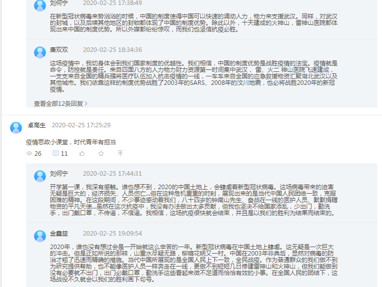 在教学平台讨论区,同学们积极留言,表达“抗疫思政第一课”的感想、战胜疫情的必胜信念和对中国制度优越性的切身体会。刘何宁同学留言说:“开学第一课,我深有感触。谁也想不到,2020的中国土地上,会肆虐着新型冠状病毒。这场病毒带来的危害无疑是巨大的,经济损失、人员伤亡...... 84岁的钟南山先生、奋战在一线的医护人员、默默捐赠物资的平凡天使......,我的内心充满了对他们的崇敬。”