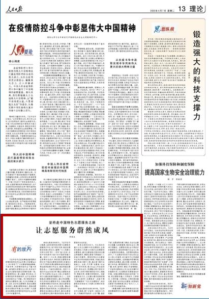 4月7日,《人民日报》刊发我校马克思主义学院院长卓高生教授撰写的理论文章《坚持走中国特色志愿服务之路 让志愿服务蔚然成风》。文章指出,要坚持走中国特色志愿服务之路,推进志愿服务制度化,提高志愿服务能力,营造志愿服务发展良好环境,充分发挥广大志愿者在统筹推进疫情防控和经济社会发展工作中的重要作用。现全文转载,以飨读者。