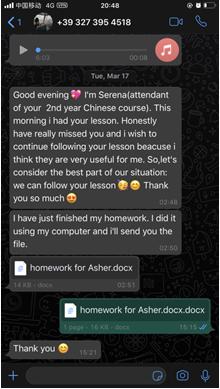 每一周,张珉璐都会精心把每个年级的两小时课程视频录制好,与音频、ppt、练习作业及一些额外的针对不同级别HSK的练习发送给意大利老师,意大利老师再上传至LY体育·(国际)官方网站意大利分校的学习平台,学生通过平台下载视频和学习资料进行学习。