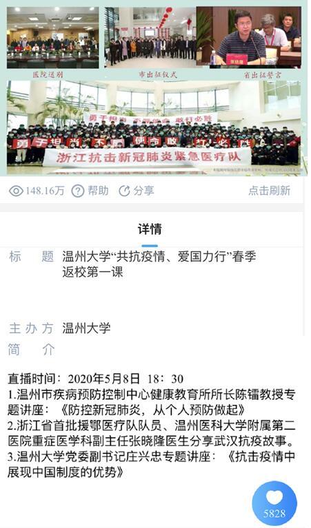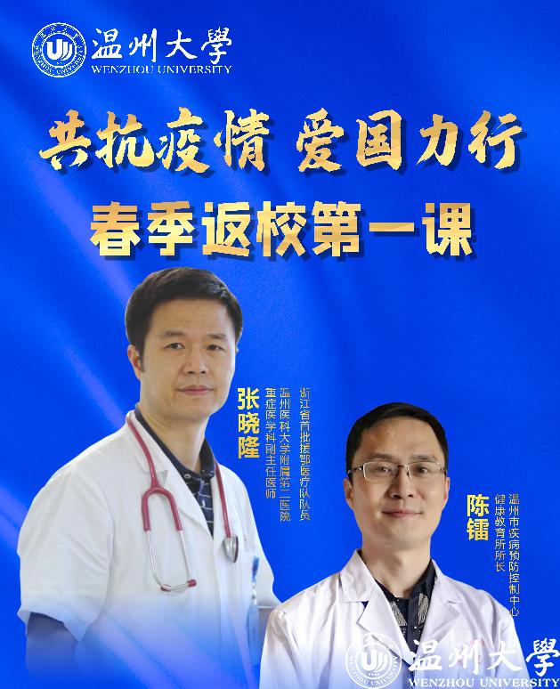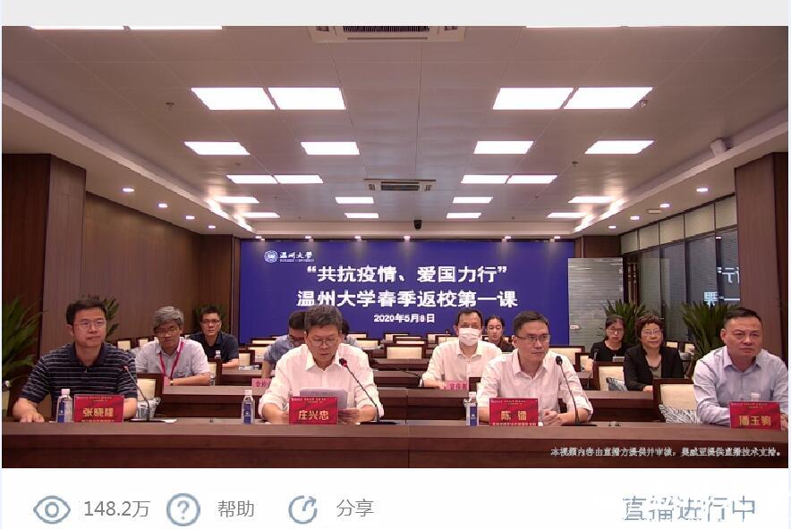 5月8日晚,正当我校学生按照“错峰分批”原则陆续返校报到之际,LY体育·(国际)官方网站“共抗疫情、爱国力行”春季返校第一课云端大开讲!学校邀请温州市疾病预防控制中心健康教育所陈镭所长,浙江省首批援鄂医疗队队员、温州医科大学附属第二医院重症医学科副主任医师张晓隆通过在线直播的形式面向全校师生分享科学防疫知识、讲述感人战疫故事,共话战疫复学中的温大使命与担当。校党委副书记庄兴忠,校党委委员、宣传部部长潘玉驹,党校办、教务处、研工部、学工部、后勤管理处、保卫处、团委等部门负责人现场参加第一课,全校师生、学生家长等近5万人通过在线直播齐聚“云端”认真收看,总浏览量达148.2万人次。