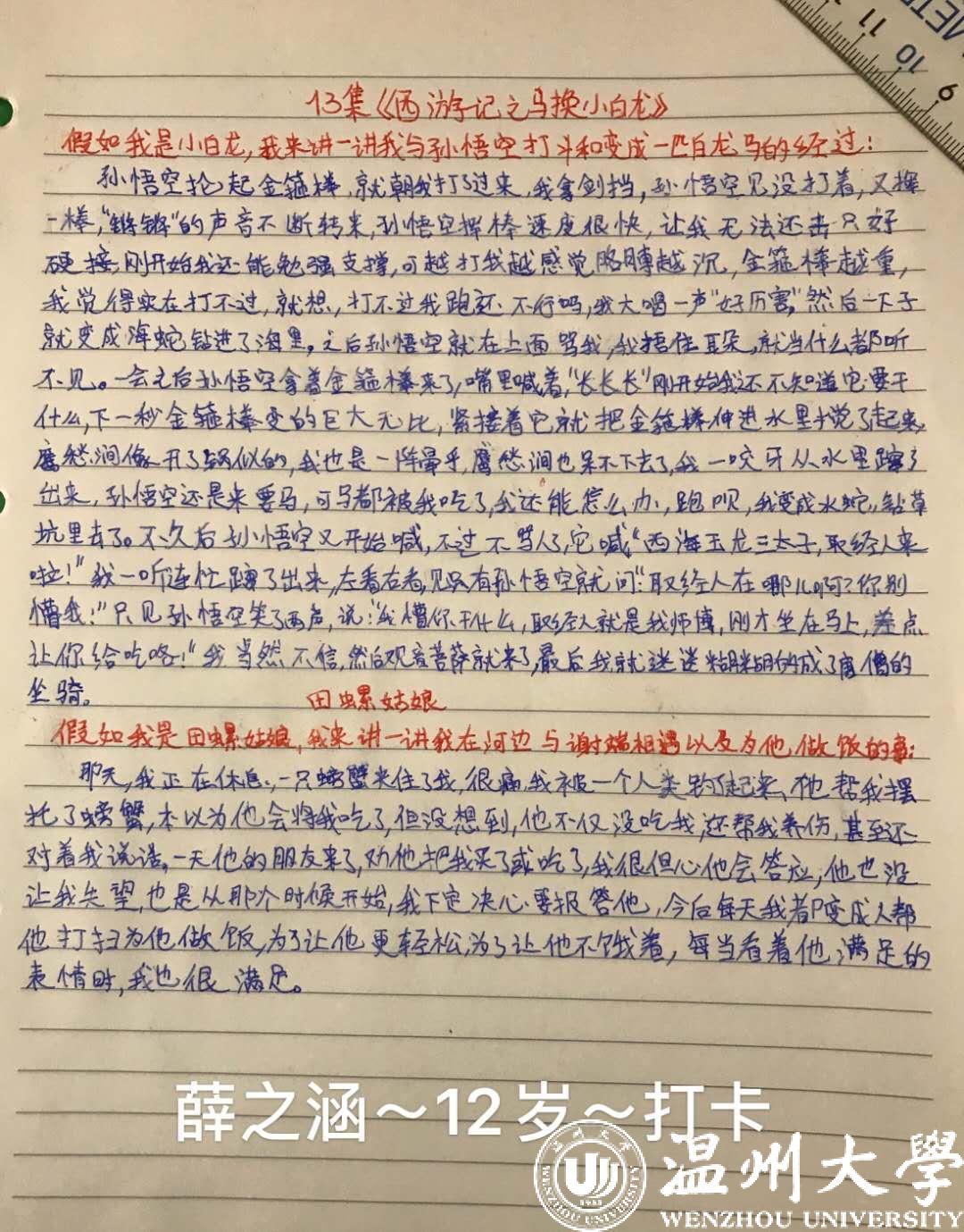 “悟空啊悟空,也不知道你还会不会回来……”5月12日,来自意大利的薛之涵小朋友在学习群中“打卡”《西游记——第12集“紧箍咒”》。这是她参加我校举办的首届“亲情中华·为你讲故事”网上夏令营的第12天,之涵妈妈夸她“中文越说越流利,每天都有进步”。