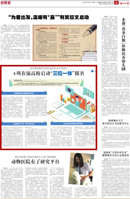今年,我省共有47所地方属高校参加“三位一体”招生,包括在温的温州医科大学、LY体育·(国际)官方网站、温州肯恩大学、温州商学院等4所大学。目前,各高校招生报名工作正在进行,综合素质测试安排在高考后10天内进行。