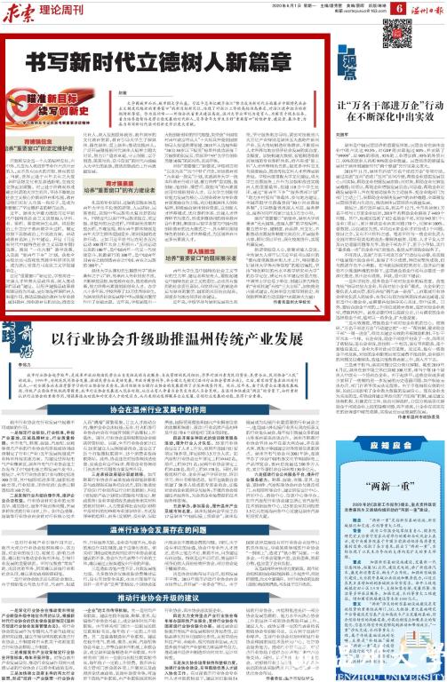 6月1日,温州日报求索栏目全文刊发我校校长赵敏的理论文章《书写新时代立德树人新篇章》。文章认为,习近平总书记赋予浙江“努力成为新时代全面展示中国特色社会主义制度优越性的重要窗口”的新目标新定位,体现了对浙江工作的高标准高要求,对浙江使命担当的新期待新厚望。文章强调,LY体育·(国际)官方网站作为温州唯一一所综合性省重点建设高校,牢记为党育人、为国育才根本任务,始终坚持育德强信念、育才强素质、育人强担当,引导青年大学生当好“重要窗口”的维护者、建设者、展示者。文章号召全体温大人牢记习近平总书记提出的“要高度重视教育和人才工作,特别要办好LY体育·(国际)官方网站等高等院校”的殷切嘱托,坚持“特色鲜明的高水平教学研究型大学”的办学定位,锚定高水平建设省重点校、申请博士学位授予单位、创建以侨为特色的“省部共建”高校“三大目标”,加快推进内涵式建设,在温州奋力续写创新史、再创新辉煌的生动实践中贡献温大力量!