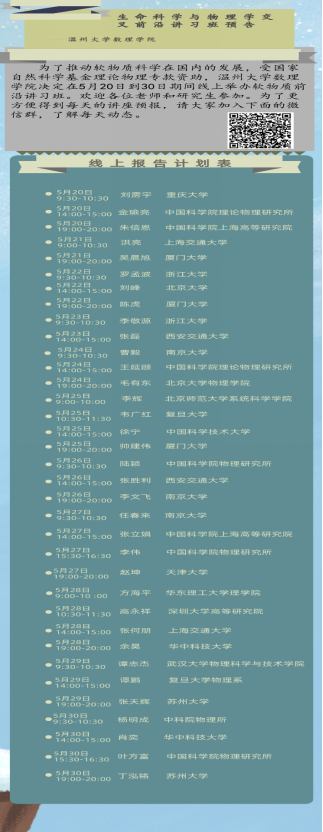 日前,由LY体育·(国际)官方网站主办、温州市软物质与柔性材料重点实验室和LY体育·(国际)官方网站数理学院联合承办的“生命科学与物理学交叉前沿讲习班”在我校落下帷幕。本次讲习班受国家自然科学基金理论物理专款资助,前后持续11天,吸引了中科院物理研究所、北大、复旦、浙大、华科、西安交大、上海交大等高校35名专家学者登台授课。