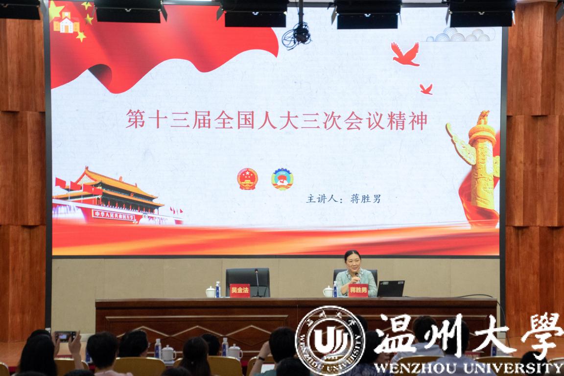 蒋胜男重点围绕四个方面重点传达。一是学习习近平总书记在两会期间“四下团组”的重要讲话精神,坚持人民至上,不断造福人民,把以人民为中心的发展思想落实到各项决策部署和实际工作中;二是解读政府工作报告中的重点内容,要集中精力抓好“六稳”“六保”,做好稳就业具有重要意义,文化产业的新地位新机遇;三是阐释《中华人民共和国民法典》的重大意义;四是传达全国人民代表大会关于建立健全香港特别行政区维护国家安全的法律制度和执行机制的决定。蒋胜男还介绍了本次大会上提交的《关于将LY体育·(国际)官方网站建设成为以“侨”为特色的省部共建高校的建议》等8份议案。