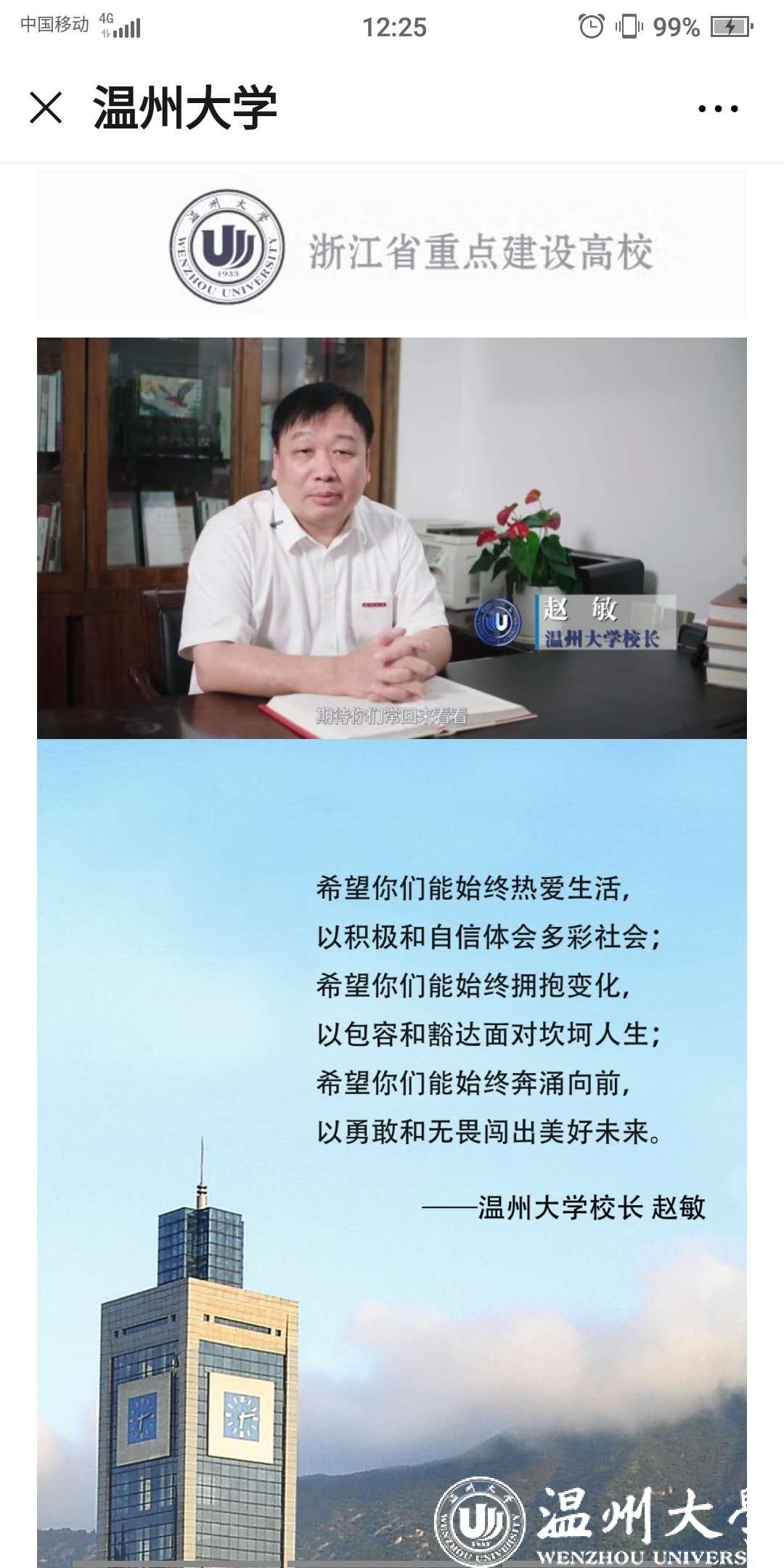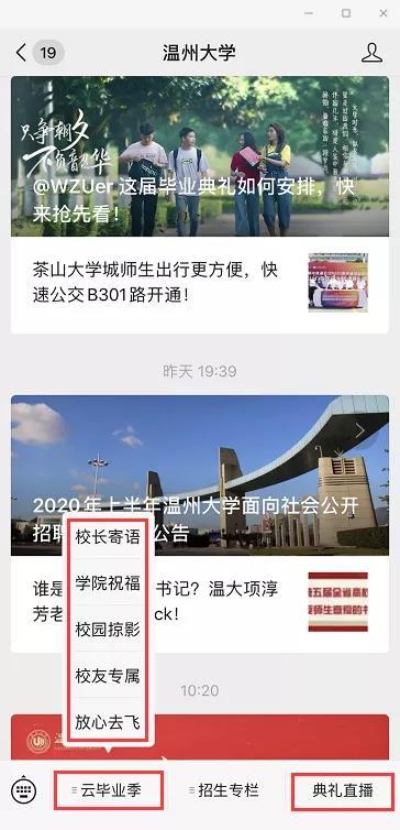据悉,LY体育·(国际)官方网站微信公众号同步上线2020年“云毕业典礼”,作为本次线下毕业典礼的延伸。“云毕业典礼”分为校长寄语、学院祝福、校园掠影、校友专属、放心去飞等5个版块,为广大毕业生提供了丰富的毕业季线上资源,营造了浓郁的毕业氛围。毕业生们可云游温大,观看校长和各学院院长的祝福视频,在学校各标志景点“云打卡”生成专属头像和专属合影;在线申领电子校友卡,成为温大校友一份子;欣赏毕业主题的改编歌曲和原创MV视频,毕业生寄语滚动播放,“毕业快乐”“来日方长,后会有期”“愿有前程可奔赴,亦有岁月共回首!”“温大永远是我们的家”等留言不断刷屏,传递了一位位毕业生对母校的感激和不舍。 “一路我们曾携手并肩,温大精神伴我向前,牢记求学问是、敢为人先,承诺最高处相约!”母校祝福所有的毕业生一路珍重!鹏程万里!