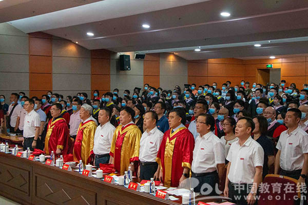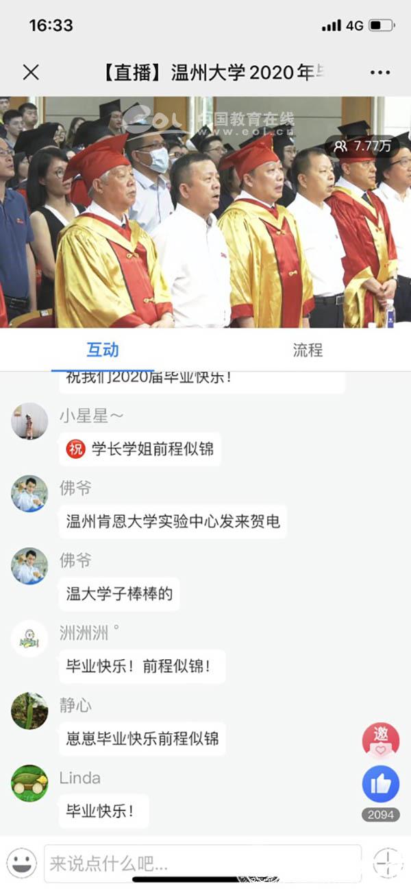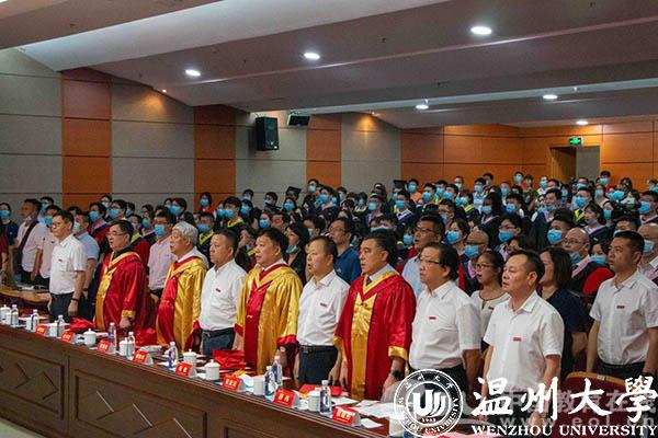 “东海水,雁荡山,我温大精神,浩浩宕宕……”师生们齐唱校歌,忆往昔朝气蓬勃,望明日繁花似锦。此次毕业典礼还同步进行了网络直播,有近8万人次在线观看参与了毕业典礼。