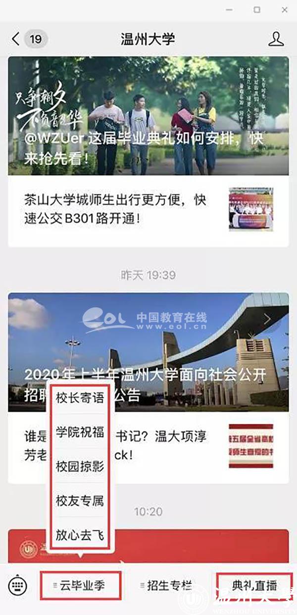 据悉,为了让受疫情影响不能到场的毕业生感受到毕业氛围,LY体育·(国际)官方网站微信公众号同步上线2020年“云毕业典礼”,作为本次线下毕业典礼的延伸。“云毕业典礼”分为校长寄语、学院祝福、校园掠影、校友专属、放心去飞等5个版块,为广大毕业生提供了丰富的毕业季线上资源,营造了浓郁的毕业氛围。毕业生们可云游温大,观看校长和各学院院长的祝福视频,在学校各标志景点“云打卡”生成专属头像和专属合影;在线申领电子校友卡,成为温大校友一份子;欣赏毕业主题的改编歌曲和原创MV视频,毕业生寄语滚动播放,“毕业快乐”“来日方长,后会有期”“愿有前程可奔赴,亦有岁月共回首!”“温大永远是我们的家”等留言不断刷屏,传递了一位位毕业生对母校的感激和不舍。 “一路我们曾携手并肩,温大精神伴我向前,牢记求学问是、敢为人先,承诺最高处相约!”LY体育·(国际)官方网站祝福所有的毕业生一路珍重!鹏程万里!