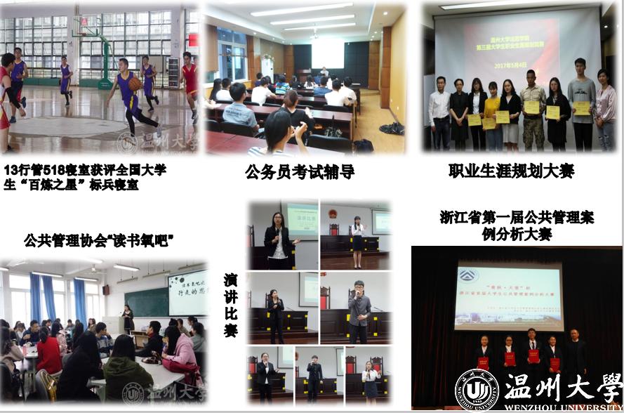 温大行政管理专业秉持“培育公共精神、促进社会善治”理念,专业的核心竞争力在于解决公共事务,关注公共领域众人之事,我们培养的学生关注点从高楼广厦到田间地头,从政府考核到扶贫济困,从政府官员到社区居民……我们致力于培养学生的公共精神,“治国平天下,理政定乾坤”是莘莘学子不懈追求的目标。温大行政管理专业学生开拓精神、实践能力和社会责任感强,深受用人单位欢迎。近年来行政管理专业初次就业率均为100%,毕业生“就业率”“工资水平”与“创业率”三项指标省属高校同类专业排名第一,学生总体满意度、教师教学水平满意度以及国内读研和境外升学率高于省内同类专业。