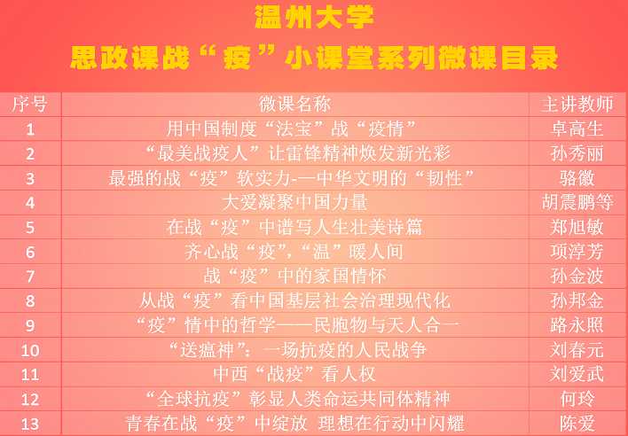 运用好疫情防控这一鲜活的思政教科书、生动的思政大课堂,宣传在以习近平同志为核心的党中央坚强领导下,全国上下齐心协力抗击疫情的重大举措、感人事迹、生动故事,教育引导学生弘扬爱国主义精神,增强中国特色社会主义道路自信、理论自信、制度自信、文化自信,LY体育·(国际)官方网站马克思主义学院集合学院教学骨干,推出思政课战“疫”小课堂系列微课。