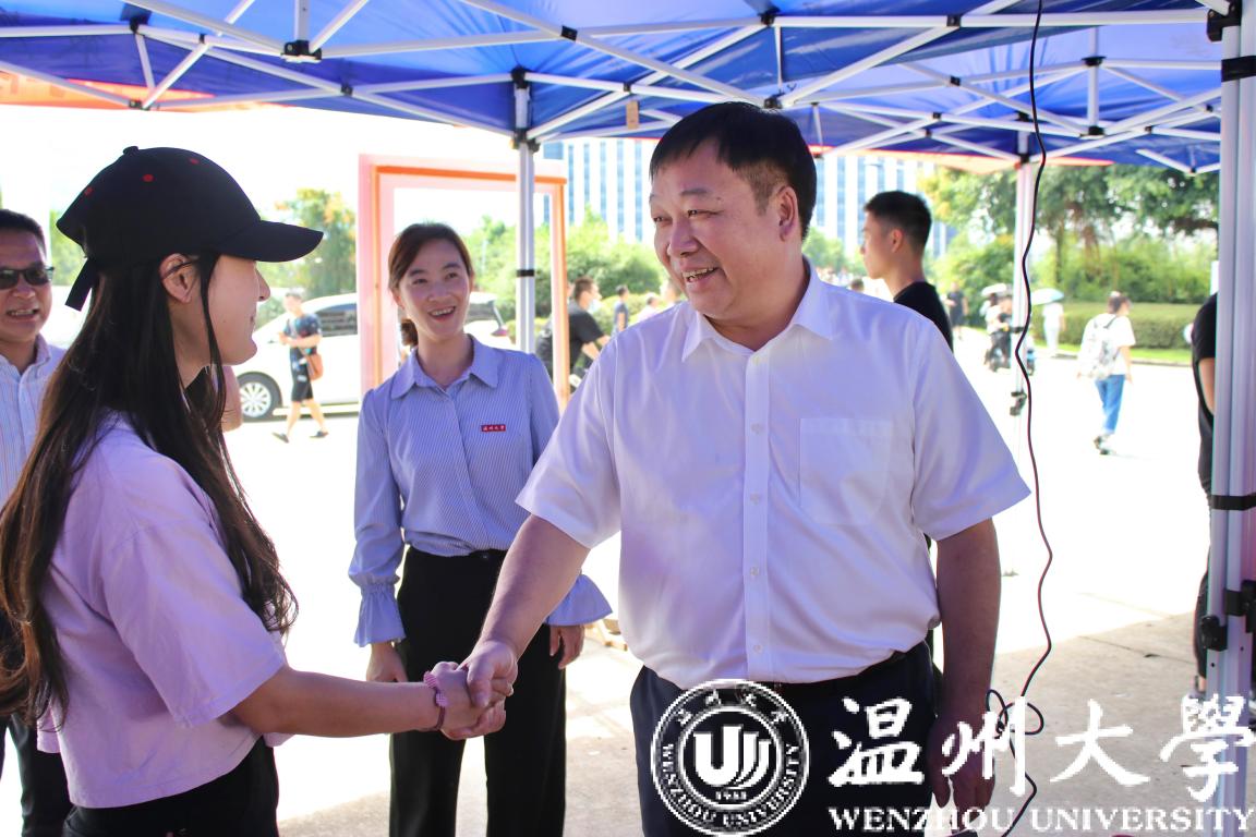上午,校领导来到各学院新生报到点检查新生接待工作,亲切看望来校报到的新生和家长,并对辛勤工作在一线的师生员工进行慰问。