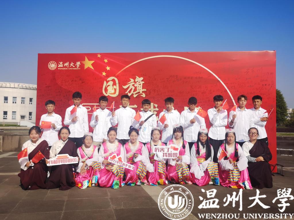 升国旗、唱国歌、国旗文化宣讲、国旗颂……西藏班的25名学生穿上节日的盛装,齐声高歌《我和我的祖国》,共同为伟大祖国庆祝生日。来自那曲的21岁男孩西热托美表示:“当五星红旗迎风飘扬在我面前的时候,我内心油然而生一种积极上进,努力奋斗的心。我为我的祖国感到自豪。”副班长姆朗措姆也表示:“我来到了期待已久的大学,虽然有许多新奇和挑战,但是温大的老师、同学们的关怀与帮助让我们充满信心,我们会尽自己的力量,为祖国发展作出贡献!”