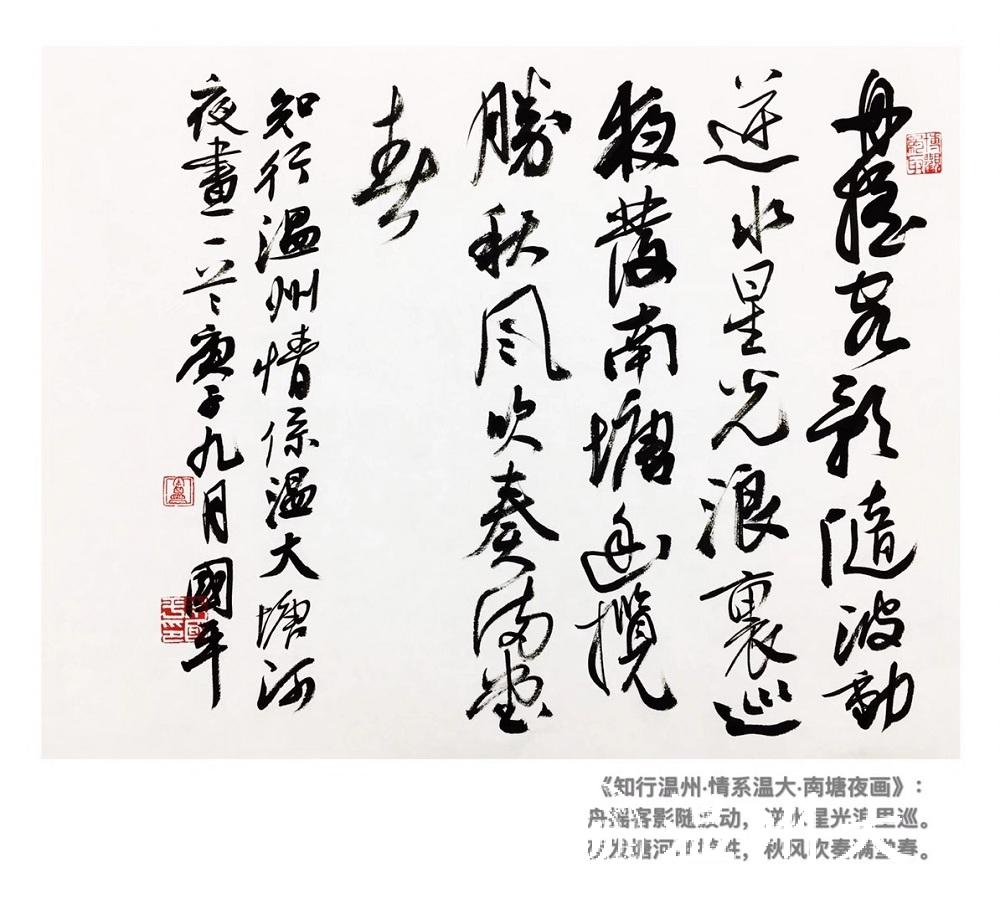 老师们纷纷表示,“感谢学校精心安排,此次活动让我们深刻体会到了学校党委对人才的关心关爱,我们深受鼓舞,倍感温暖!”“此次活动让我们加深了对温州的感知,促进了同事之间的沟通与交流。”“今天的活动不仅让我感受到温大的温暖,也让我这个土生土长的温州人更了解家乡,更热爱家乡!”。三届“兰亭奖”获得者、美术与设计学院高层次人才朱国平老师有感而发,即兴创作书法作品《南塘梦影》并赋诗《知行温州·情系温大·南塘夜画》,以表达心中难抑的激动之情。
