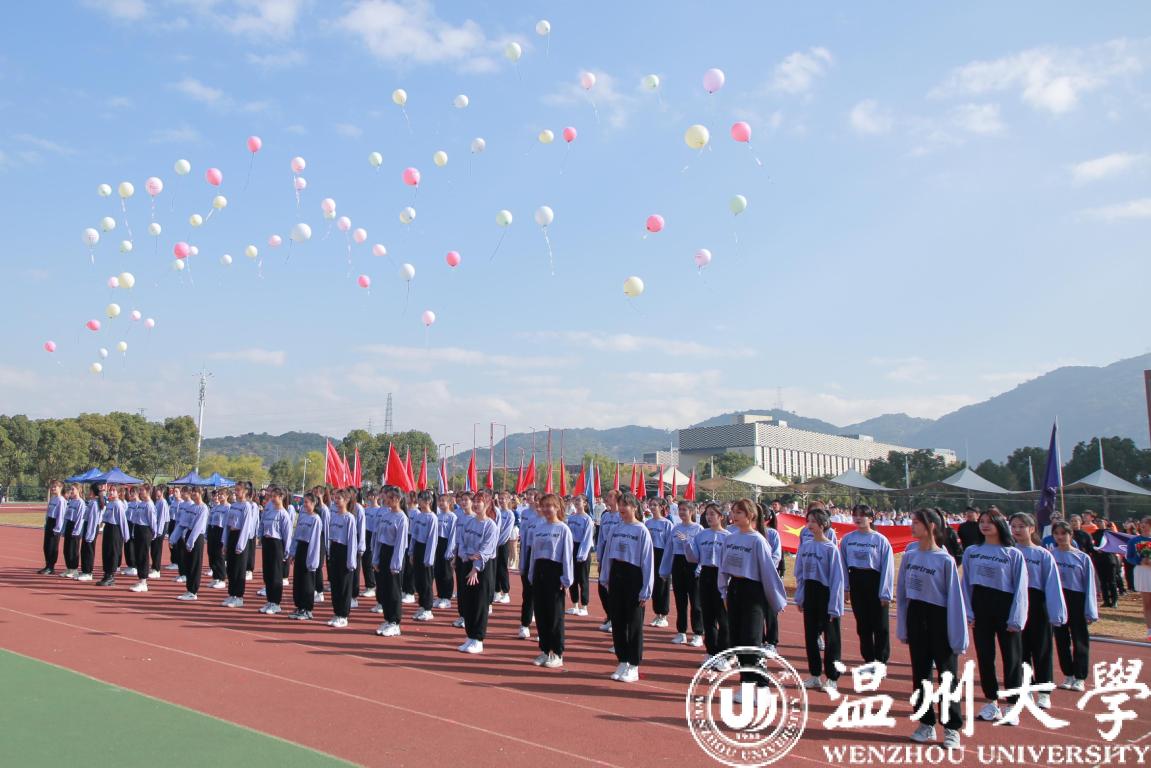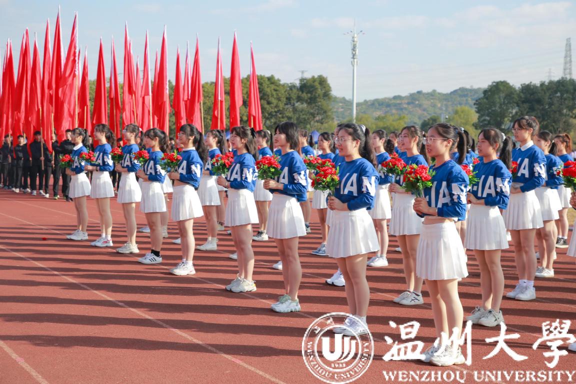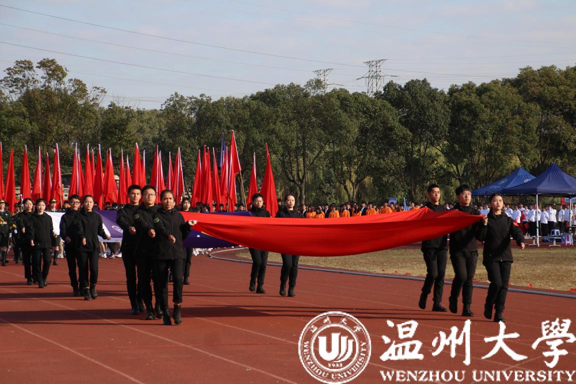 在雄壮的运动员进行曲中,校国旗护卫队迈着矫健的步伐走来。鲜红的国旗在空中挥动,彰显着温大学子的青春和热血。紧随其后的鲜花队和彩旗队充满朝气和力量。