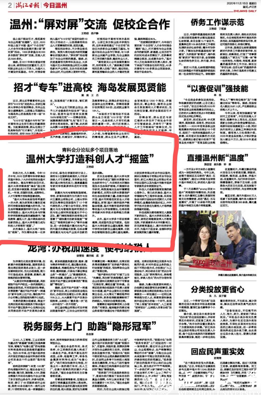科技之光,久久璀璨。今年10月中旬,2020世界青年科学家峰会在温州举办,7大分论坛活动由LY体育·(国际)官方网站承办。继去年青科会召开后,LY体育·(国际)官方网站持续承接“峰会”溢出效应,在交流中谋发展、在创新中育先机,一年来,在国际交流、成果转化、人才引育等方面取得显著成效。