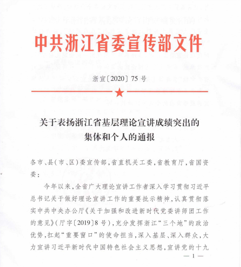 近日,从省委宣传部获悉,我校马克思主义学院“罗山博士宣讲团”荣获2020年浙江省基层理论宣讲成绩突出集体(浙宣2020 (75)号文件),全省高校仅浙江大学和我校获奖。