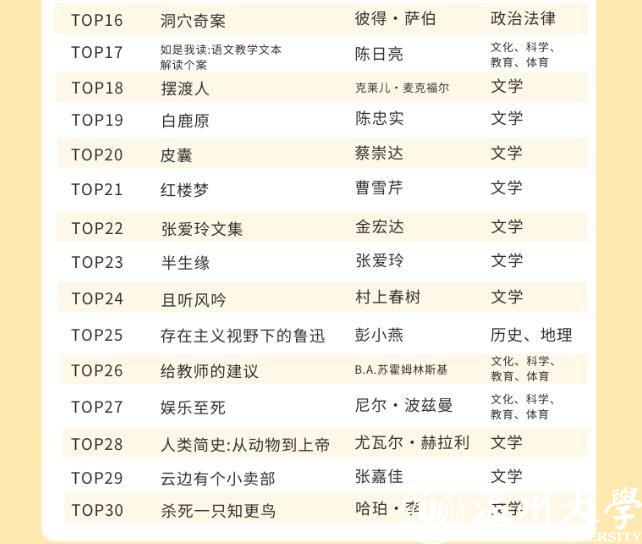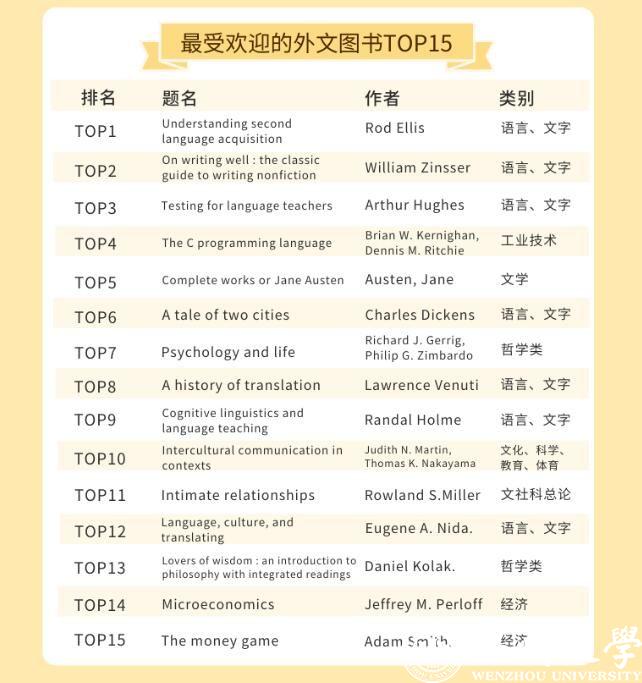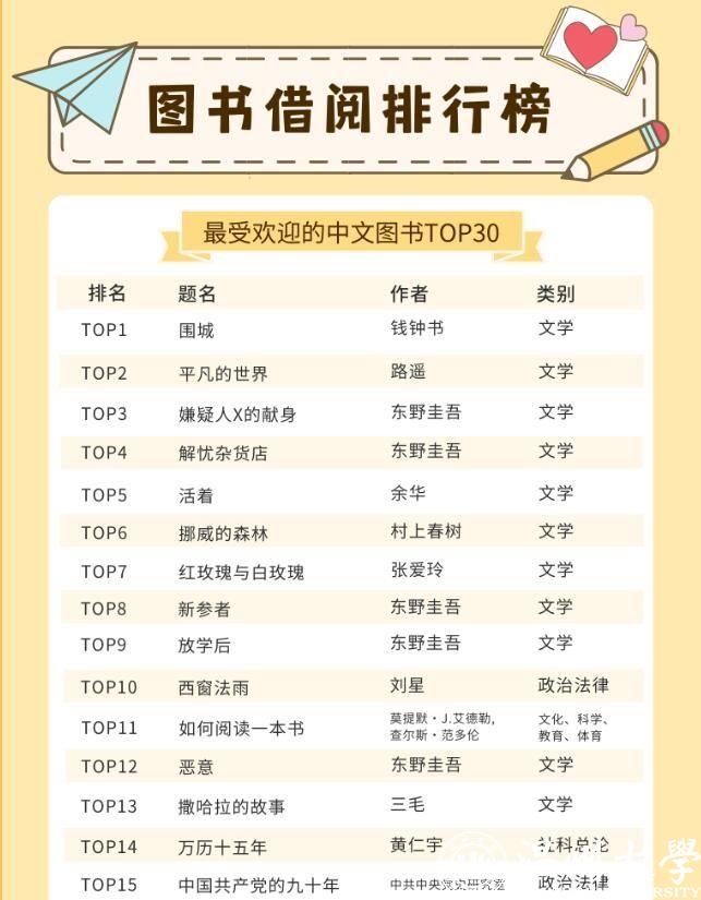 LY体育·(国际)官方网站的师生都喜欢借阅哪些中外文图书呢?在最受欢迎的中文图书TOP30榜单里,21本书为文学类别图书,占比达到70%。最受温大师生喜欢的书为钱钟书的《围城》,排在榜首。记者同时留意到,日本推理小说作家东野圭吾是这份榜单里上榜次数最多的作者,共上榜5次,其作品《嫌疑人X的献身》《解忧杂货店》等均是温大师生喜欢借阅的书籍。