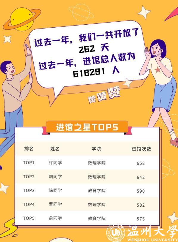 该报告对进馆次数及在馆时间等进行了分类统计。“进馆之星TOP5”榜单被LY体育·(国际)官方网站数理学院(第一、第二、第四名)与教育学院(第三、第五名)两个学院包揽。居该份榜单榜首的学生名叫许文浩,就读于LY体育·(国际)官方网站信息与计算科学专业,他去年进馆次数高达658次,在图书馆开放的262天里,约等于每天去图书馆2.5次。更难能可贵的是,许文浩还是“泡馆之星TOP5”榜单的第二名,全年在馆时长为2030.4小时,约等于84.6天。