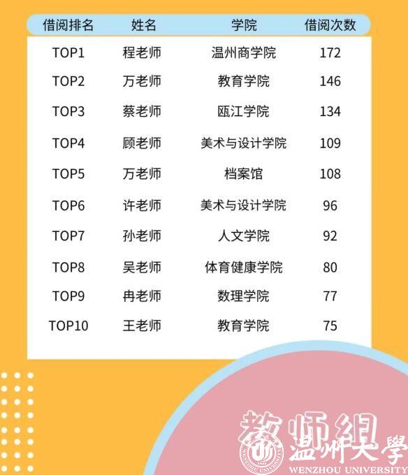 该份报告还对读者借阅次数进行了排名。读者借阅排行榜(本科生组)显示,排在第一位的蒋同学借阅次数高达113次,也即在图书馆开放的262天里,他平均0.43天借阅一次。与学生相比,温大教师的借阅次数会更多。读者借阅排行榜(教师组)显示,前三名教师的借阅量分别为172次、146次、134次。教师榜前三名的借阅总量达到452次,比本科生榜前三名的借阅总量289次多出163次。