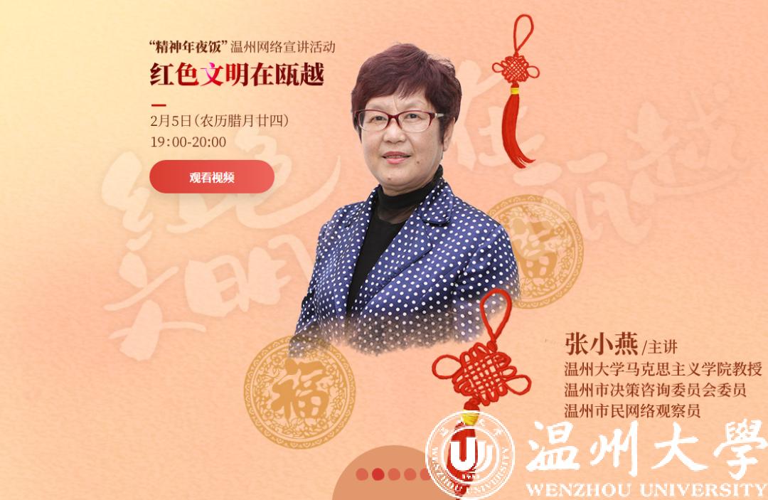 在北京时间2月5日晚上7点—8点,南方小年夜之际,邀请张小燕为在外温州人带来“精神年夜饭”的“头盘菜”——《红色文明在瓯越》。让在外温州人通过此次网络主题宣讲,了解发生在家乡温州这片土地上的那些可歌可泣的红色故事。