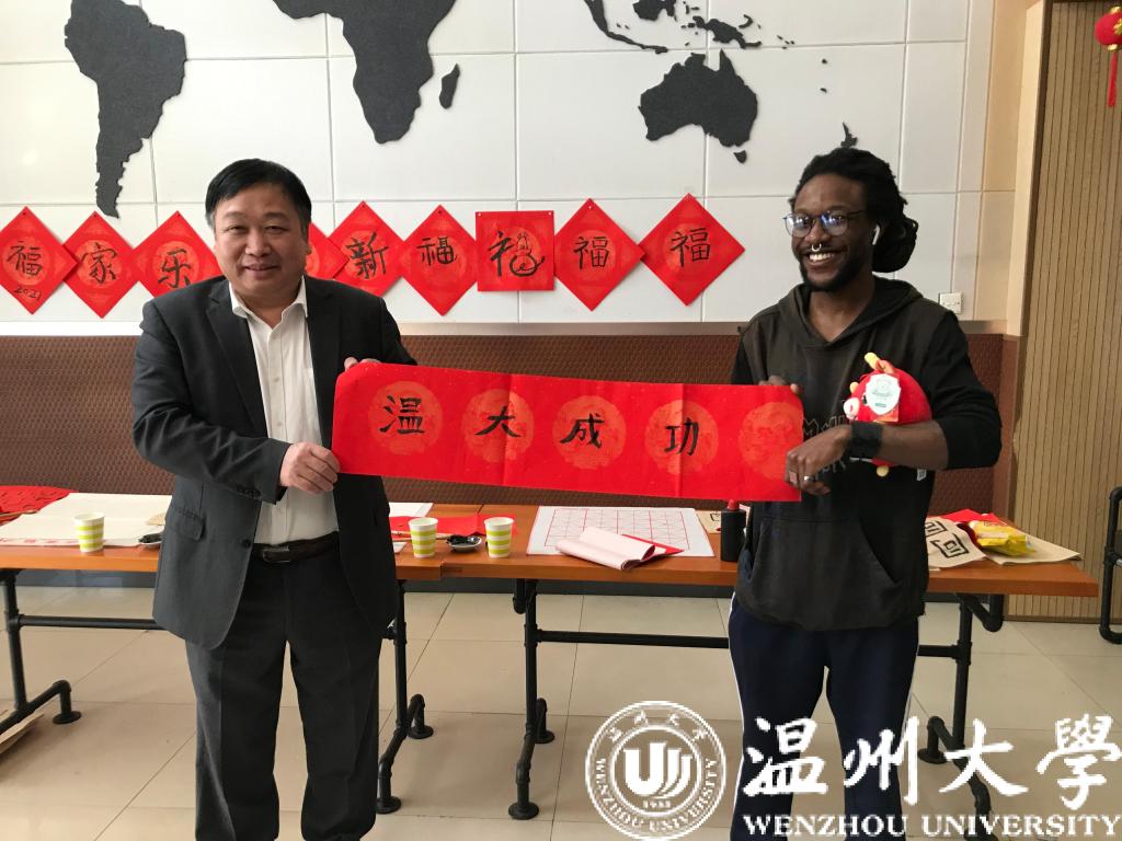 校长赵敏观看了留学生各项比赛并与他们亲切交流,了解学生们留校的学习生活情况,并向留学生送上了新春大礼包,留学生代表还向校长赠送了自己写的新春“福”,并用中文新春祝福语表达感谢之情。