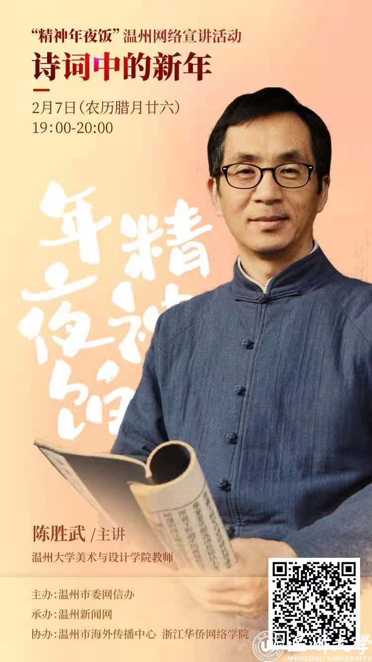 2月5日下午4点,“打卡中国·在温过年”小年夜直播活动之“诗词中的新年”在衍园美术馆进行直播。陈胜武老师作为主讲嘉宾,发挥专业特长,从诗词、吟诵、书法三个角度,和大家分享了晚清民国以来五首描写小年夜和新年民情风俗的《温州竹枝词》,以及王安石《元日》,讲解了温州方言中积淀的深厚历史文化底蕴,并给大家现场用温州话和普通话进行吟诵,还在节目中为大家献上自己书写的春联“五云迎晓日,万福集新春”,现场书写福字,透过荧屏给海内外温州人送福。浓厚的温州特色、高雅的艺术品味、活泼的现场氛围,受到在场领导和观看直播网友的热烈好评。浙江华侨网络学院、温州新闻网、海外发布、喜马拉雅APP温州专辑、掌上鹿城等多家媒体和单位进行了直播报道。