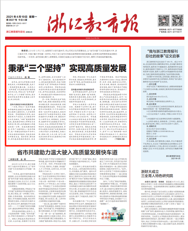 【编者按】4月19日,《浙江教育报》头版刊发我校校长赵敏署名文章《秉承“三个坚持” 实现高质量发展》。文章指出,LY体育·(国际)官方网站以“省市共建”方式迈进省重点建设高校行列以来,学校立足“省市共建”新平台,以“三个坚持”即“坚持内涵建设与特色发展并举”“坚持重点突破与系统推进协同”“坚持服务地方与对接前沿贯通”为导向,以改革激发活力、以创新驱动发展,走出了一条高质量发展之路。现全文转载,以飨读者。