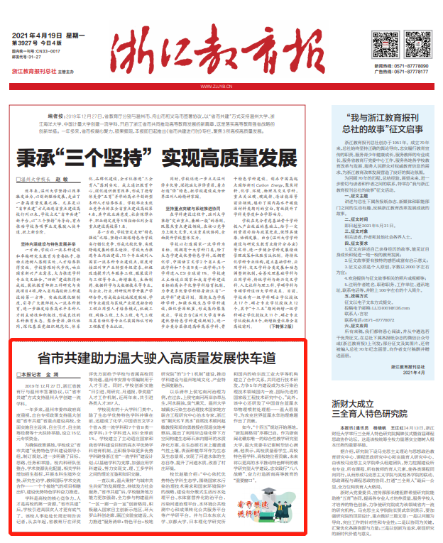 【编者按】4月19日,《浙江教育报》头版刊发我校建设发展成果文章《省市共建助力温大驶入高质量发展快车道》。文章聚焦我校迈入省重点校以来学科与人才队伍建设等方面的特色与亮点,报道了我校建设发展取得的斐然成果。现全文转载,以飨读者。