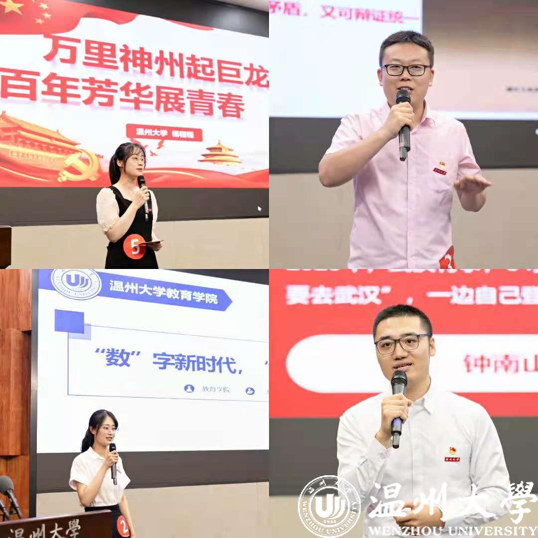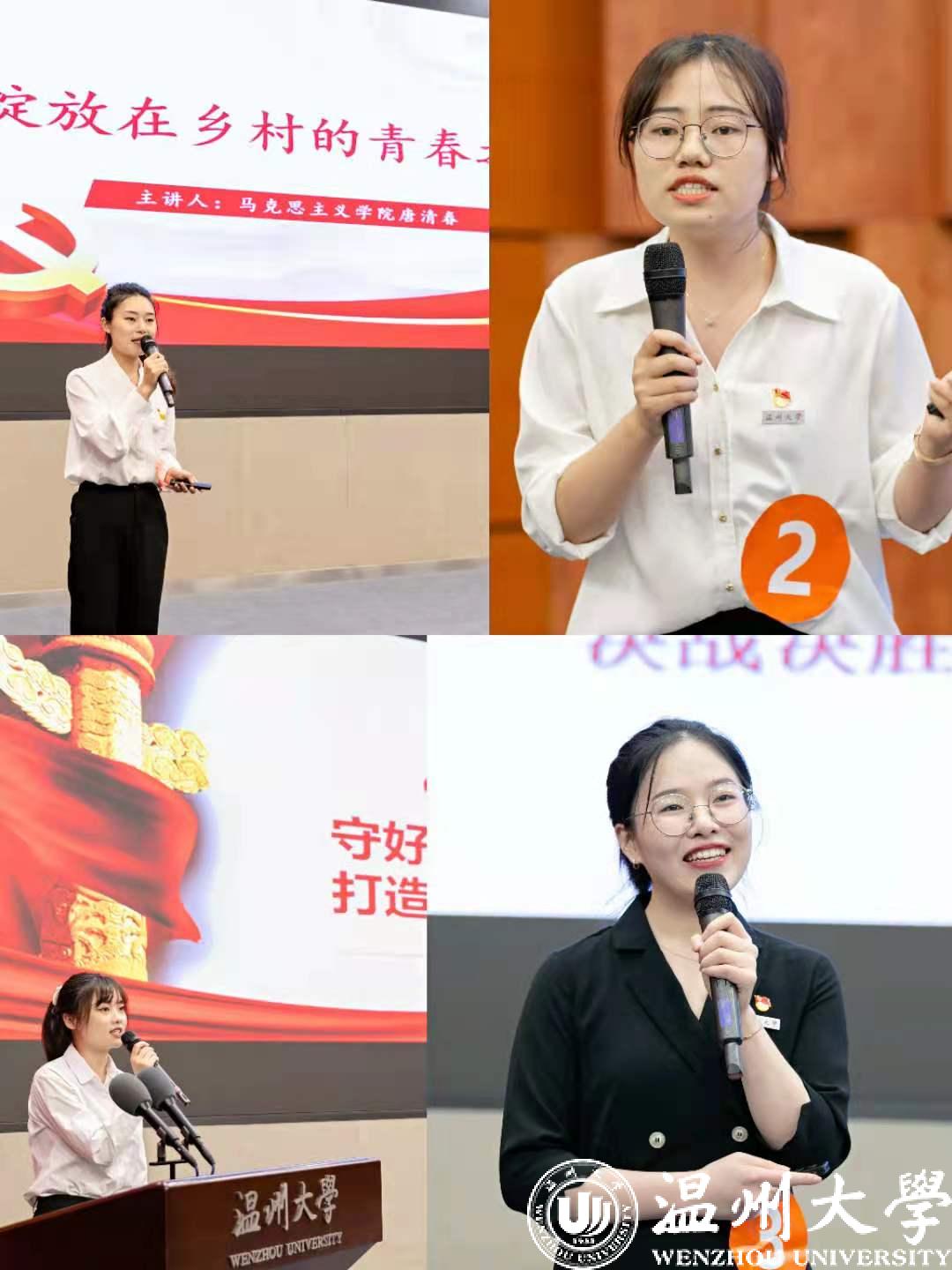 学生组的表现同样精彩纷呈,数理学院的杨飞红同学讲述了传奇的温州奋斗路;外国语学院的姜钰舒同学介绍了在平凡岗位上为“教育扶贫”事业奉献光和热的教育工作者们;马克思主义学院的唐清春同学讲述了青年党员在“前线”用汗水、智慧甚至是生命帮扶贫困地区发展美丽乡村的事迹;人文学院的韩旭同学介绍了温州革命岁月中播下的一个个火种……