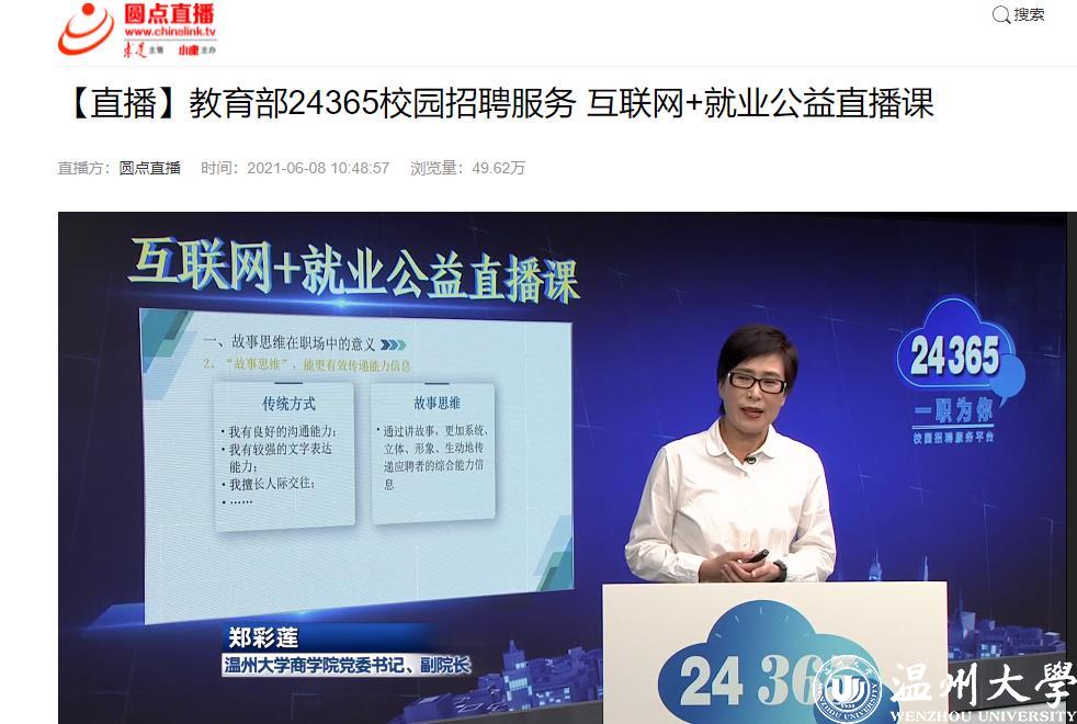 6月13日,我校郑彩莲教授受邀做客中国教育电视台,主讲“训练‘故事思维’·为职场赋能”教育部24365互联网+就业公益直播课。