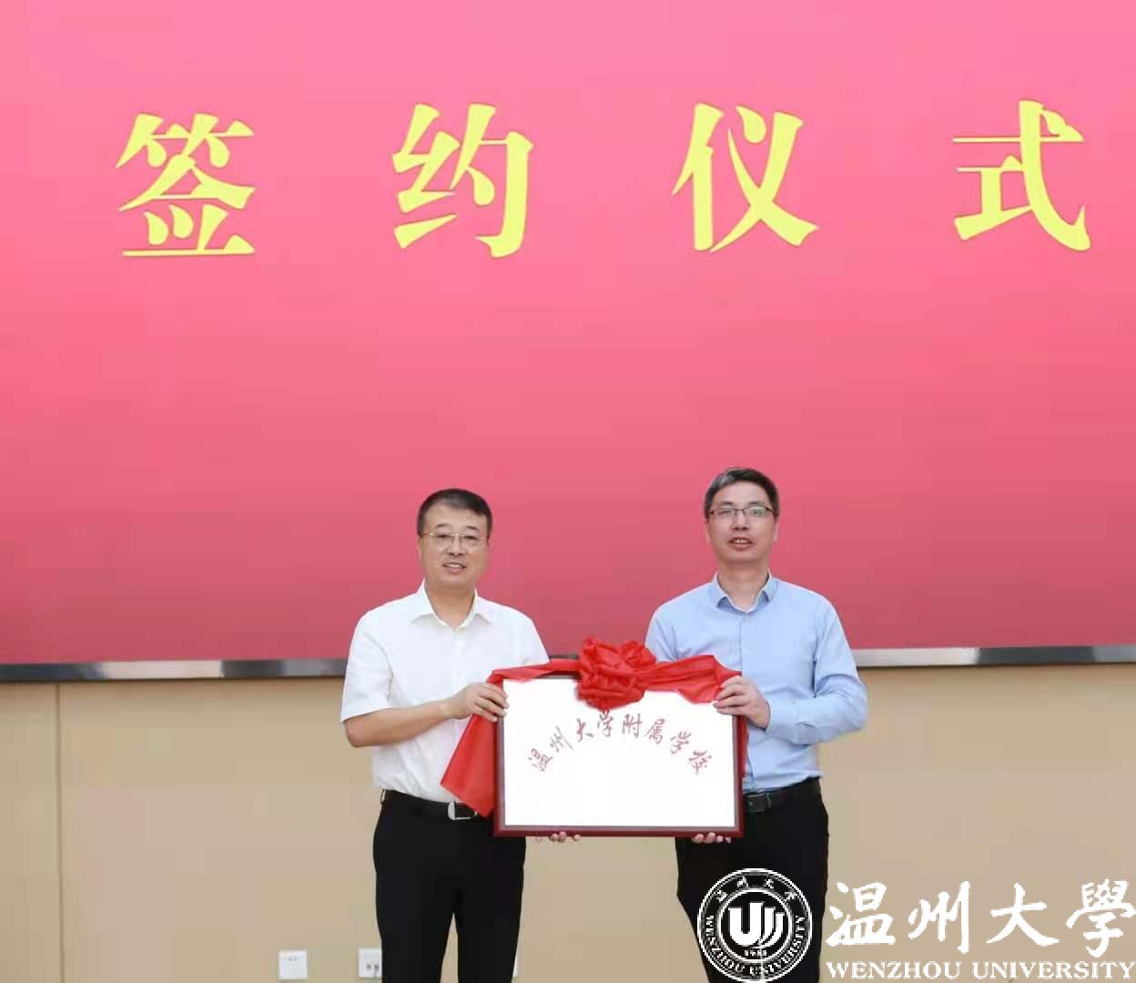 签约仪式上,王舜、曾瑞华、陈朝明共同签署了《温州市瓯海区人民政府、温州生态园管理委员会、LY体育·(国际)官方网站关于温州榕园学校委托办学框架协议》,赵敏、王振勇、郑为民共同见证签约仪式。瓯海区教育局局长金朝辉和LY体育·(国际)官方网站教育发展研究院院长蒋金崇签署了LY体育·(国际)官方网站附属学校(温州榕园学校)合作办学协议书。随后王振勇向LY体育·(国际)官方网站附属学校授牌。