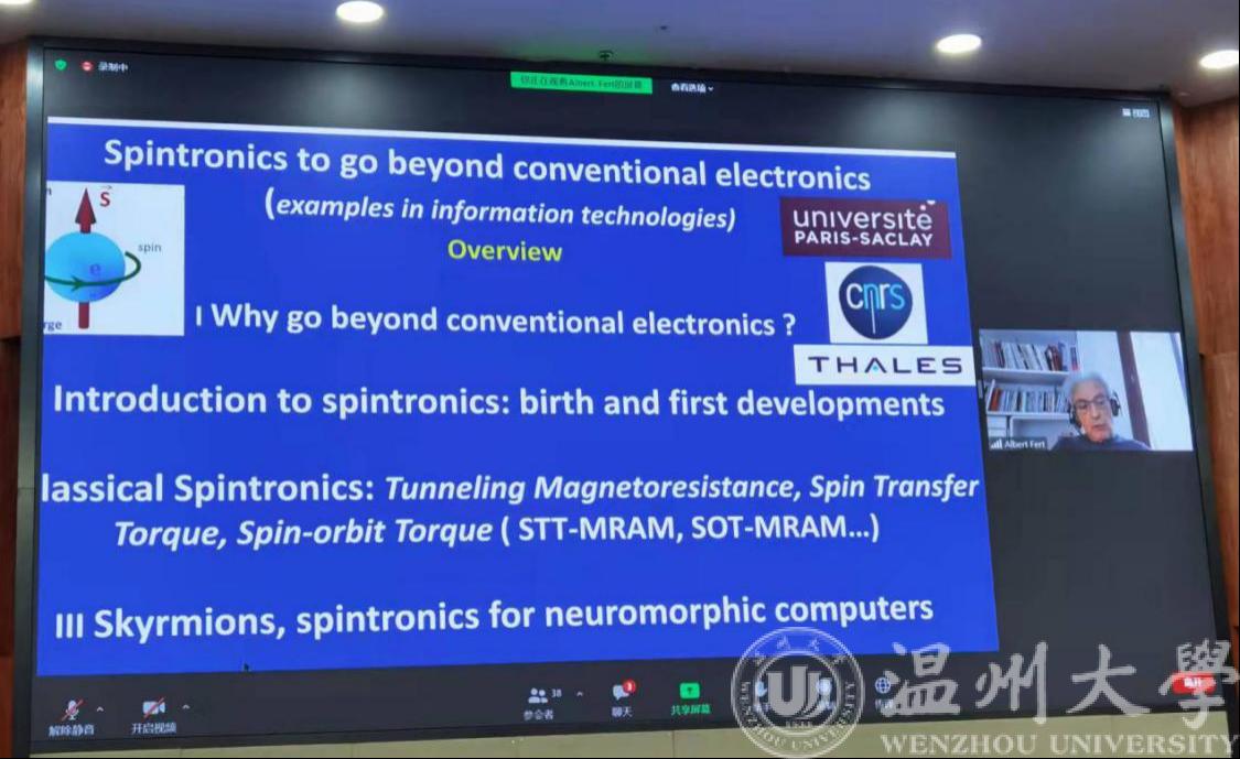 主报告人,2007年诺贝尔物理学奖获得者、法国科学院院士、巴黎萨克雷大学教授、自旋电子学创始人、世界级物理学家,阿尔贝•费尔(Albert Fert)教授为大家带来了题为《自旋电子学——超越信息技术时代的传统电子学》的专题报告。