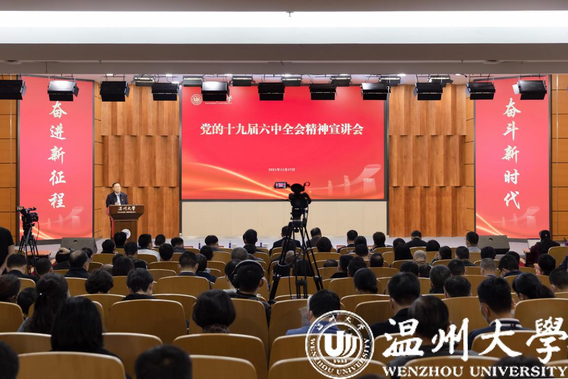 为深入学习贯彻党的十九届六中全会精神,切实把思想和行动统一到六中全会精神上来,11月17日下午我校党的十九届六中全会精神宣讲会在岩松堂雁山厅举行。校党委副书记庄兴忠主持会议,校党委委员、宣传部部长潘玉驹做专题宣讲报告。全体校领导、中层干部、教工党支部书记和各学院师生代表300余人参加宣讲会。