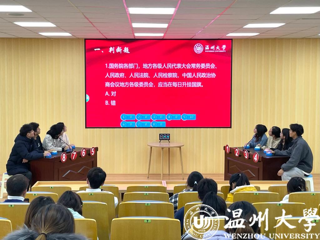 12月1日,“宪法宣传周”系列活动之“习近平法治思想”知识竞赛我校举行。知识竞赛重点围绕习近平法治思想相关内容,设有判断题、单选题、多选题和逻辑题。700余名学生参与到知识竞赛初赛环节,最终24名选手进入决赛。决赛现场紧张热烈,答对得分、答错扣分的竞赛机制也为比赛增加了更大的悬念。知识竞赛充分检验了大学生对习近平法治思想、宪法知识的掌握程度,将法治学习的知识性与趣味性融为一体。