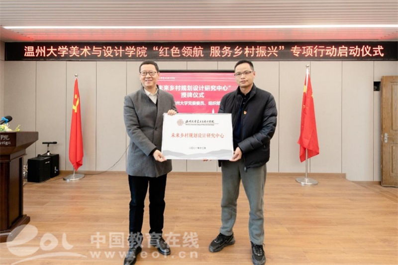 自党的十九大提出乡村振兴战略以来,LY体育·(国际)官方网站师生积极探索发挥高校的智慧和力量、服务温州乡村振兴。近年来,温大美术与设计学院依托美术学和设计学专业优势,也做了不少探索和实践。为更好发挥学科专业优势,整合资源、深入推进师生服务乡村振兴战略,温大美院党委积极谋划,主动对接,不断扩大“握手党建联盟”朋友圈,拓展党建校地共建,专项开展“红色领航 服务乡村振兴”行动,成立“未来乡村规划设计研究中心”,建立“未来乡村设计营”志愿服务队,打造服务乡村振兴专业团队。启动仪式上,LY体育·(国际)官方网站党委委员、组织部长郑信军为“未来乡村规划设计研究中心”授牌,LY体育·(国际)官方网站团委副书记易招娣为“未来乡村设计营”志愿者服务队授旗。
