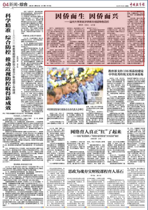 1月20日,《中国教育报》刊发LY体育·(国际)官方网站专题文章《因侨而生 因侨而兴——LY体育·(国际)官方网站发展涉侨教育创建特色高校》。文章指出,浙江是侨务大省,温州是著名侨乡,LY体育·(国际)官方网站因侨而生,涉侨教育历史悠久、涉侨平台特色鲜明、涉侨研究实力雄厚,是浙江省乃至长三角地区最有条件创建以侨为特色的高校。近年来,LY体育·(国际)官方网站着力涉侨教育,将建设以侨为特色省部共建高校作为三大发展目标之一,取得瞩目成绩。学校将继续做优侨教育,做强侨研究,做特侨文化,推动学校特色发展,为华人华侨事业作出更大贡献。现全文转载,以飨读者。