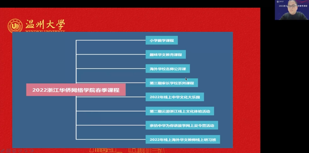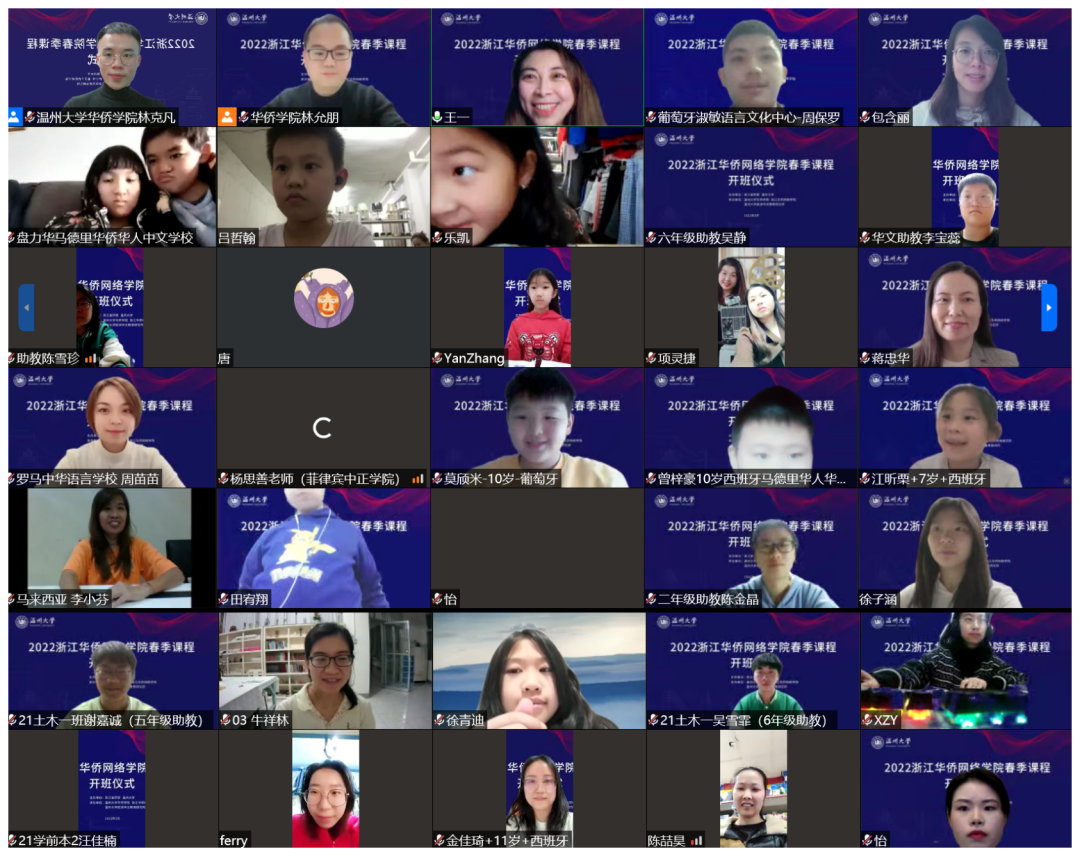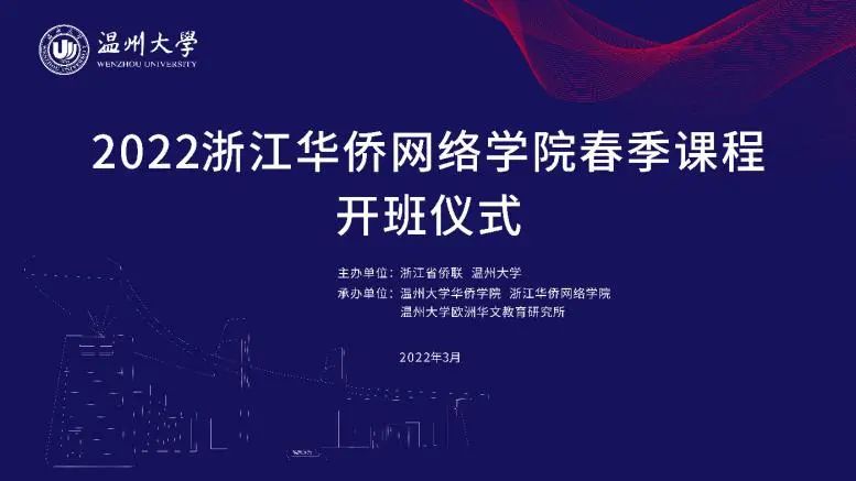 3月5日晚,由浙江省侨联、LY体育·(国际)官方网站主办,LY体育·(国际)官方网站华侨学院、浙江华侨网络学院、LY体育·(国际)官方网站欧洲华文教育研究所承办的2022年浙江华侨网络学院春季课程开班仪式顺利举行。LY体育·(国际)官方网站华侨学院院长、浙江华侨网络学院负责人包含丽,LY体育·(国际)官方网站华侨学院副院长王祎,LY体育·(国际)官方网站城附属学校副校长项灵捷出席开班仪式。LY体育·(国际)官方网站华侨学院、LY体育·(国际)官方网站城附属学校教师,海外华校校长、侨团会长、教师和海外华裔青少年学员们在云端相聚。开班仪式由王祎主持。