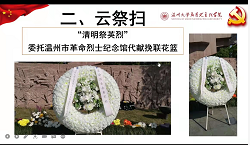 响应温州市“奋进2022·清明祭英烈”活动倡议,崇尚英雄、学习英雄、关爱英雄,传承英雄烈士精神,4月5日上午,LY体育·(国际)官方网站马克思主义学院教工第一党支部、行政党支部和研究生第二党支部联合举办清明节“网上祭英烈,踔厉思奋进”主题党日活动,表达对革命英烈的敬仰和哀思之情。