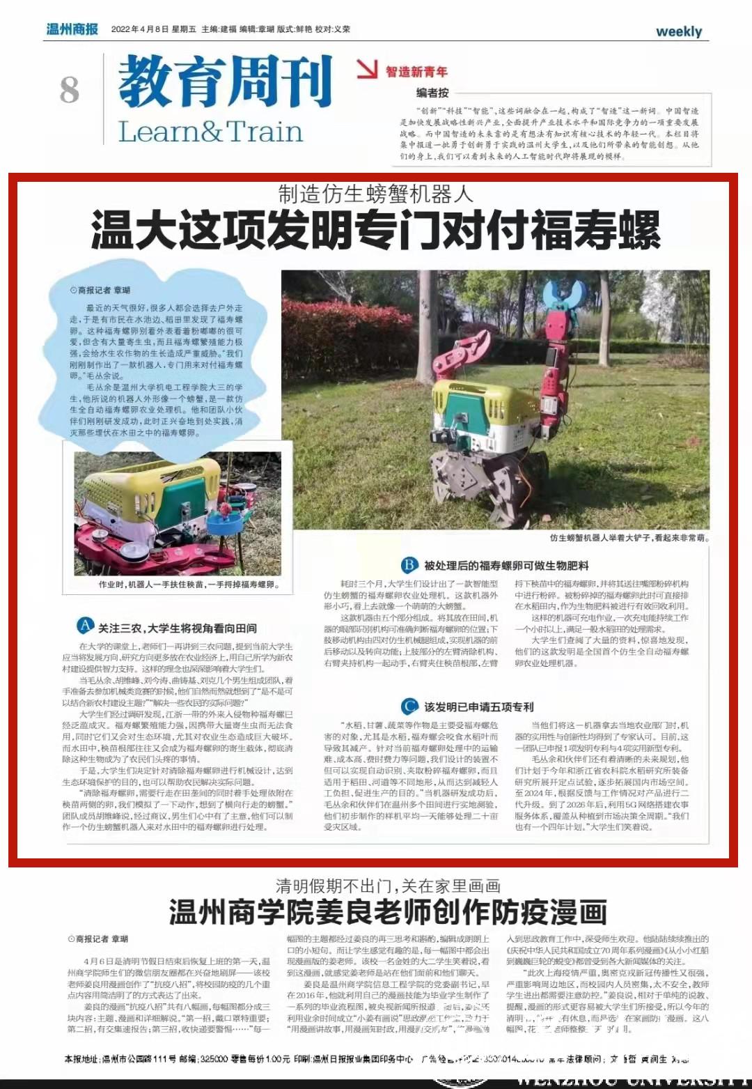 “水稻、甘薯、蔬菜等作物是主要受福寿螺危害的对象,尤其是水稻,福寿螺会咬食水稻叶而导致其减产。针对当前福寿螺卵处理中的运输难、成本高、费时费力等问题,我们设计的装置不但可以实现自动识别、夹取粉碎福寿螺卵,而且适用于稻田、河道等不同地形,从而达到减轻人工负担、促进生产的目的。”当机器研发成功后,毛丛余和伙伴们在温州多个田间进行实地测验,他们初步制作的样机平均一天能够处理二十亩受灾区域。