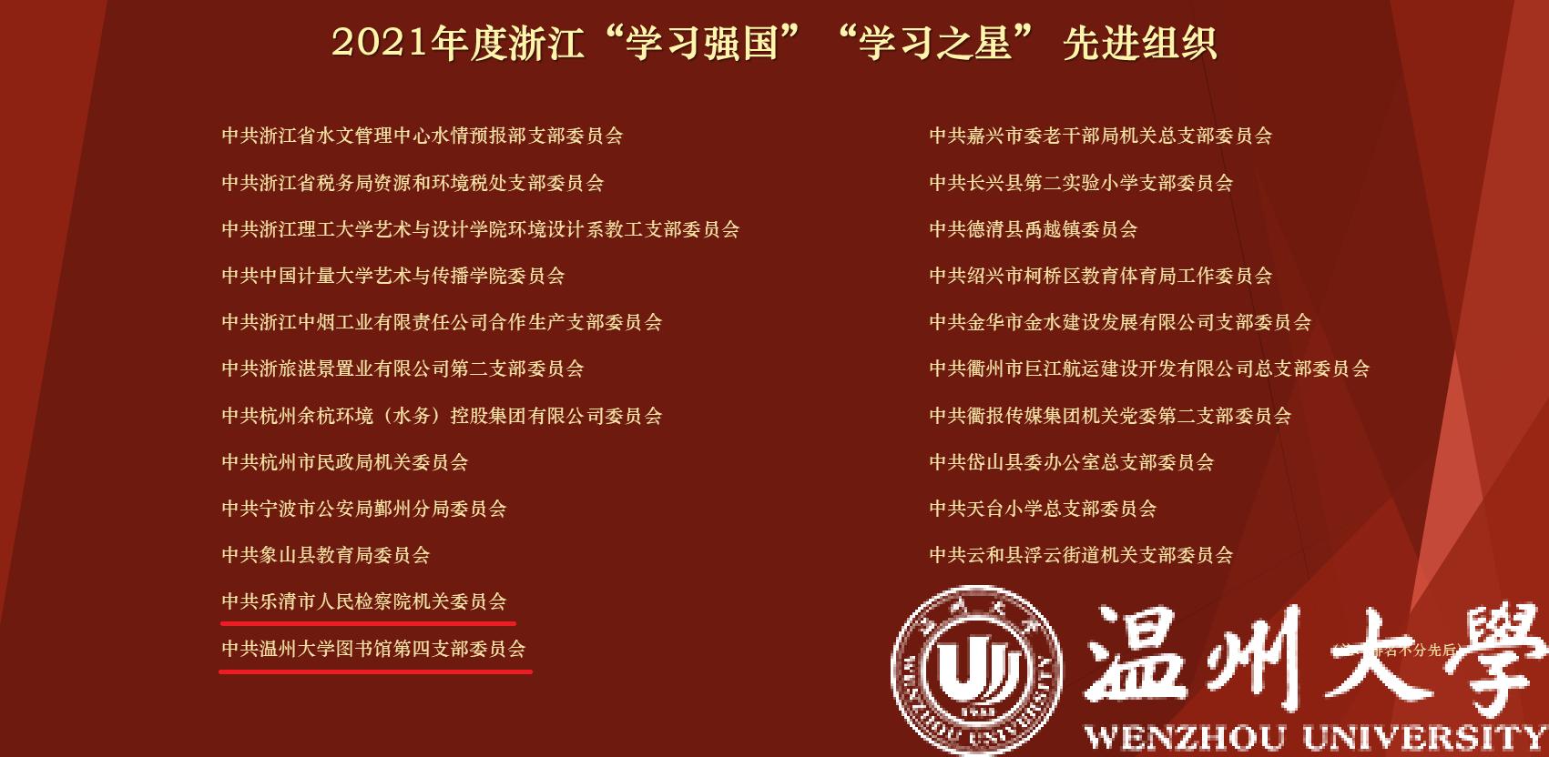 4月19日,2021年度“学习强国”浙江学习平台线上授奖交流活动举行。活动公布2021年度浙江“学习强国”“学习之星”先进组织和先进个人,温州市选送的中共LY体育·(国际)官方网站图书馆第四党支部、中共乐清市人民检察院机关委员会获“学习之星”先进组织;温州市自来水有限公司的麻鹿环、温州瑞安市住房和城乡建设局的薛孝松、温州乐清市白象中学的吴君艳获得“学习之星”称号。