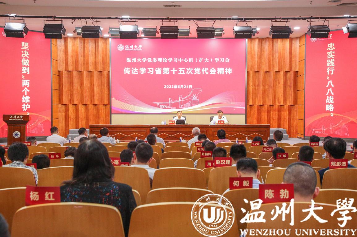 在全省上下深入学习贯彻省第十五次党代会精神之际,6月24日下午,我校在南校区岩松堂雁山厅召开党委理论学习中心组(扩大)会议,校党委书记谢树华传达省第十五次党代会精神,并就学校学习宣传和贯彻落实作出部署。校长、党委副书记赵敏主持会议。