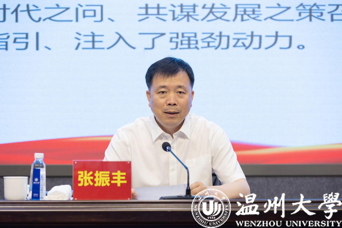 张振丰结合报告原文和温州改革发展实践的一组组案例、数据,依次从“全省第三极”“创新制胜”“大都市区”“文化繁荣”“共同富裕”五个关键词出发,解读了省党代会给温州发展带来的机遇和利好。张振丰指出,一座充满创新活力的城市,背后总是闪耀着大学的光芒,温州做强“全省第三极”,教育是重要支撑,LY体育·(国际)官方网站是重要力量。张振丰希望LY体育·(国际)官方网站时刻牢记习近平总书记殷殷嘱托,认真贯彻落实省党代会精神,抢抓新机遇、彰显新担当、展现新作为,奋力推动大学与城市共生共荣、携手并进,为温州当好“两个先行”的开路先锋发挥更大作用。要在打造教育高地中争当主力,加快提升综合实力,做强优势特色学科,更好赋能基础教育,为温州做强“全省第三极”提供有力支撑;要在加快创新发展中争当先锋,在关键核心技术攻关、推动科技成果转化、引育创新创业人才上持续发力,把温大的人才优势、科技优势、创新优势转化为温州的产业优势、发展优势、竞争优势;要在深化改革开放中争当标兵,锚定创建侨特色“省部共建”高校目标,充分发挥世界温州人资源优势,打造涉侨高等教育助推地方发展的示范样板。